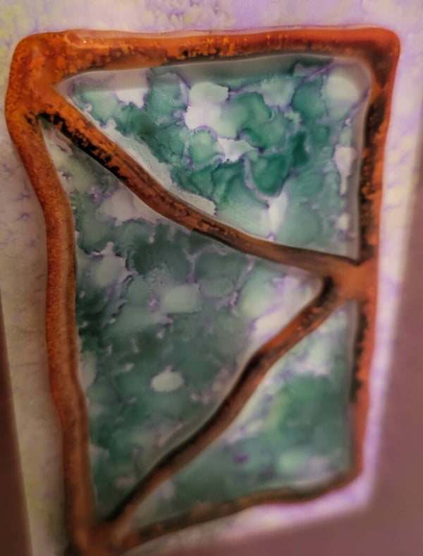 Alcohol ink on glass, enhanced with dimensional paint. 11"x11" framed.