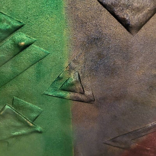 Sandblast-carved thick glass, with color and special backing. (Not translucent) 24"x17" with chipped edges
